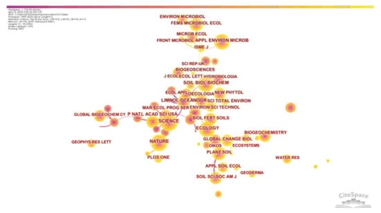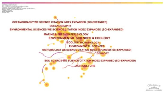 The node type was set to the cited journal, and the time slice was set to 1 year to generate a map of cocited journals [45]. In the CiteSpace analysis, the number of nodes in the distribution of journals is 1967, the connection value is 17,114, and the density is 0.0081. The top five journals cited in order of the number of applications are Nature, Science, Applied and Environmental Microbiology, Ecology, and Soil Biology & Biochemistry, all of which have more than 6000 applications. The top four most academically influential journals, according to centrality rankings, are the Journal of Cleaner Production (0.05), Science of The Total Environment (0.04), Environmental Science & Technology (0.04), and Chemical Reviews (0.04). The top ten journals mainly focus on natural sciences, environmental microbiology, ecology, biology, oceanography, and the environment. These subjects are the field’s main research directions, and more details are shown in Table 3. The results shown in Figure 3 demonstrate that the establishment of the ZCC can significantly impact global climate change and indirectly affect the fields of ecology, biology, and the ocean.