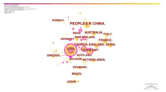 The analysis of the regional cooperation distribution of publications can reflect the publication results, the cooperation and cross-citation relationship between major countries in this research area, and the importance and influence of the country in the ZCC [46]. CiteSpace analyzes the regional cooperation distribution of postings in the ZCC domain. We found that the regional cooperation distribution of postings contains 278 nodes, 130 connections, and a density of 0.0034. The primary posting region mapping is shown in Figure 4. From 1997 to 2022, U.S. institutions published 5741 articles, Chinese institutions published 4180 articles, and German institutions published 1569 articles. As shown in Figure 4, the U.S. is the leading country that contributed to the field of ZCC, and it has the most cooperation and cross-citation with other countries with a centrality of 1.03. More details about the contributing countries are shown in Table 4. Canada has close cooperation with Germany, China, the U.K., Australia, France, Spain, Italy, and the Netherlands by close cooperation between them. The lack of cooperation between Germany, Canada, and other countries with a large number of publications suggests that there is great potential for developing international cooperation networks for the globalization of research on ZCCs as a global issue. By 2020, the countries with the most carbon emissions were China, the USA, India, Russia, Japan, Iran, and Germany [47]. Therefore, to solve the global carbon emission problem, the United States, China, and Germany have performed much research for this purpose and published many papers in the field of ZCCs.