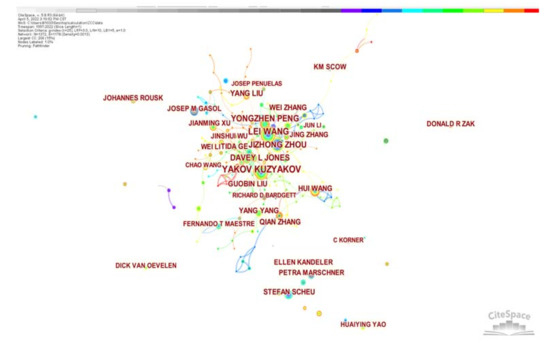 Collaborative authorship analysis identifies the core figures in the research field and the collaboration and cross-citation relationships between researchers [48]. A collaborative group of scholars can be analyzed to uncover the team effect of academic research [49]. The ZCC-related data were gathered and imported into CiteSpace. The author collaboration network graph contained 1372 nodes, 1178 connections, and a density of 0.0013, and the knowledge graphs of the primary authors and their institutions are shown in Figure 5. As seen from Table 5, the dominant authors are Yakov Kuzyakov (44), Lei Wang (34), Jizhong Zhou (33), and Yong hen Peng (30). Researchers studying ZCC are mainly from China and Germany. Two of the top 10 authors, in terms of the number of publications, are from the same research institution, Georg August University of Göttingen, indicating that the research institution has more research in the field of ZCC. Among the top 10 posting researchers, Yakov Kuzyakov from the Georg August University of Göttingen and Jizhong Zhou from the University of Oklahoma had the most significant paper centrality of 0.02. Their papers are most influential in the field of ZCCs. As shown in Figure 5, the distribution of authors is fragmented. There is a lack of collaboration among researchers in the ZCC field and a lack of academic research teams with core leadership.