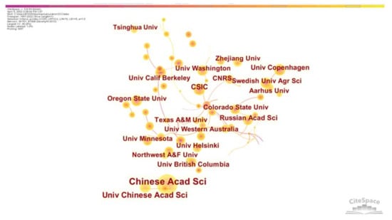 The analysis of the distribution of collaboration among research institutions provides insight into the academic support and recognition of the field, thus facilitating collaboration among institutions [50]. The core institutions in the ZCC domain were analyzed using CiteSpace, and a knowledge graph containing 751 nodes and 368 links with a density of 0.0013 was obtained. The knowledge graph of the core institutions is shown in Figure 6. Among the top 10 publishers from 1997–2022, the Chinese Academy of Sciences was first in terms of the number of articles (1317); the University of the Chinese Academy of Sciences was second in terms of the number of articles (491), and Consejo Superior de Investigaciones Científicas was third in terms of the number of articles (230). Among the top 10 institutions in the research institution collaboration centrality ranking, the Chinese Academy of Sciences ranked first (0.1). The French National Center for Scientific Research and Univ Paris 06 Center both ranked second (0.04). To a certain extent, the degree of centrality reflects the influence of the institution’s publications. As seen in Table 6, the volume and centrality rankings are not all the same, indicating that there are research institutions that publish many articles, but the quality of the articles is not high, and the influence is not significant. As shown in Figure 6 and Table 6, there is closer cooperation between research institutes, companies, and universities worldwide.