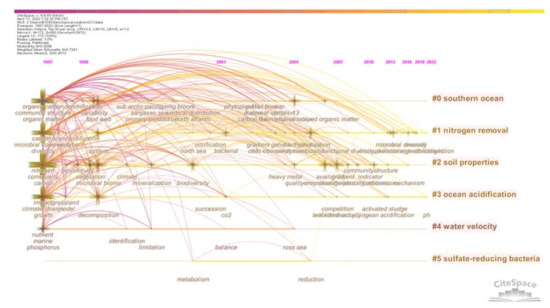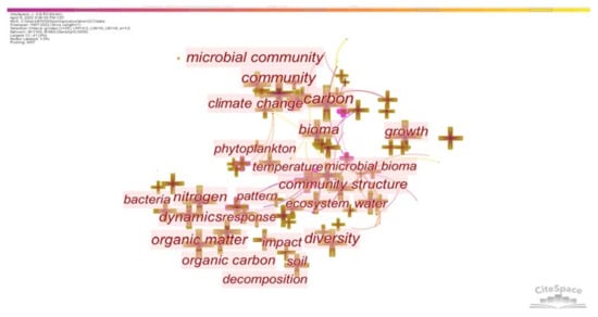 Keywords can reveal the main directions of the article’s content and its core ideas, and detect the co-occurrence frequency and emergence of keywords in the related literature in LCC and ZCC research [52]. It can visually present the research hotspots, research trends, and knowledge structure in LCCs and ZCCs. The data of 19,014 documents were imported into CiteSpace software. Using the keyword path calculation method in the software, the keywords’ co-occurrence frequency and centrality were calculated, and the keyword knowledge map was drawn. The database period was set as 1997–2022, with 1 year as the time slice and keywords as the network nodes, and the top 50 highly cited keywords in each time slice were selected to generate LCC and ZCC research keyword co-occurrence profiles (see Figure 8). A total of 1103 nodes and 563 links appeared, with a network density of 0.0009, in which larger nodes indicate the more frequent occurrence of keywords, more links indicate more co-occurrence of two keywords, and thicker links indicate a stronger connection. The top 5 essential keywords for every 5 years from 1997 to 2022 were extracted according to word frequency ranking statistics, as shown in Table 9. The statistical results show that the keywords carbon, community, diversity, microbial community, and nitrogen appear frequently and at the same time at the beginning of the LCC and ZCC studies, and are the core themes of the LCC and ZCC studies.