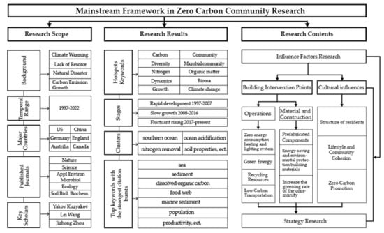 Global warming is a worldwide concern, with buildings generating more than 40% of the annual global CO2 emissions. A commonly accepted system of global standards for zero-carbon buildings and communities has not yet been established. In this research, the development history, hotspots, and trends at the urban scale with theoretical and data support are summarized based on the Web of Science (WoS) Core Collection. The review contains works from 1997 to 2022. A total of 19,014 papers were collected, with an overall increasing trend in the number of articles with specific keywords. The scope of the research is broad, covering the environment, sciences, ecology, chemistry, material science, physics, meteorology, atmospheric sciences, and so on. The hotspots in the low-carbon community (LCC) and zero-carbon community (ZCC) involve a wide range of disciplines, and collaborative research between related disciplines should be strengthened to propose practical solutions for the development of zero-carbon cities. The establishment of the ZCC mainly focuses on a zero-carbon-emission construction and zero-carbon operations. This research found approaches such as the choices of building construction and material, a waste recycling system, a regenerating energy system, transportation, and an examination of the community composition to realize the ZCC. In the literature it is presented that the difficulties in the construction of the ZCC are due to the lack of research in practice, operation, and subsequent maintenance. Moreover, other scholars can deepen the research on the hotspots of ZCC.