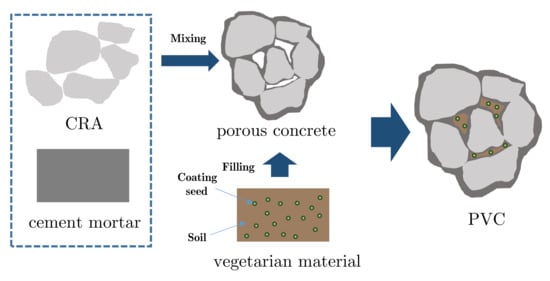 Porous vegetarian concrete (PVC) is a composite material combined with vegetarian filling and the porous concrete skeleton. The porous concrete comprises recycled aggregate bonded together with cement mortar. The filling materials contain planting solid and packing seed. Hence, the influences of a varied HPMC ratio on the performance of PVC is divided into three parts in this paper: cement mortar, porous concrete, and PVC. The schematic diagram of PVC is plotted in Figure 1.