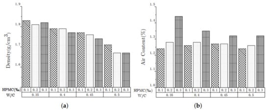 Results of density (D) and air content are plotted in Figure 2. The average densities of mortar range from 1.67 g/cm to 1.83 g/cm, which had a negative relationship with the w/c ratio significantly. In particular, Figure 2b shows that the dosage of HPMC has a more significant influence on the air content result, which is more noticeable when the w/c is below 0.4. This result was also proved by previous research [,].