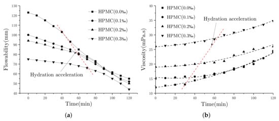 The influences of HPMC on the flow properties of fresh cement mortars are described in Figure 3. At a constant w/c (0.4), adding HPMC causes a decrease in the mortar flow and an increase in viscosity. It is noted that the curves of the flowability and viscosity versus time can be divided into the initial hydration stage and the accelerated hydration stage. We also notice that as the dosage of HPMC increased, the beginning of hydration was delayed simultaneously, which was quite similar in both the flowability and viscosity results. At the very beginning of the initial hydration stage, the increase of HPMC from 0.0‰ to 0.3‰ of the concrete mass resulted in a significant effect on both the flowability and viscosity of fresh cement mortars. The dosage of 0.3‰ of HPMC significantly affected the water demand in a w/c ratio of 0.4. The silicate reduced the influence of flowability on HPMC in cement hydrating. However, this kind of phenomenon did not exist in the viscosity results, which the Bingham model can explain with sufficient accuracy []. The flowability value was dependent on the shear stress of the fluid, which was affected by the viscosity and shear rate together.