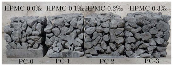The effect of the HPMC dosage on the molding form of porous concrete is shown in Figure 4. Compared with group 0.0‰, the deposition phenomenon caused by gravity can be reduced by HPMC added. The HPMC could enhance the viscosity of mortar in the previous results, which means the packing property of the cement grout was also improved in the same w/c and m/a conditions.