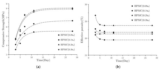 The results of the concrete strength are shown in Figure 4. The strength of the filling soil could be negligible compared with the skeleton. The results exhibit that a variable amount of HPMC can improve the strength of PVCs. The curves of all groups were similar to each other, 50% of final strength was reached at the first 3 days and 90% at the age of 7 days, and after that, the strength remained stable. When comparing the compressive strength in the 28 days hydration process, the concrete without any HPMC shows the lowest value in Figure 5a. There was about 35% of strength increasing only by the dosage of HPMC which increased to 2‱. However, changing the dosage of HPMC from 2‱ to 3‱ had no significant effect. The result of the effective porosity (Figure 5b) shows volume expansion in each RAC group at an early stage. In this case, it is difficult to conclude a clear relationship between effective porosity and strength, as in previous observations.