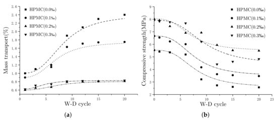 Porous concrete subjected to w-d regimes has a prominent influence on the performance. After 28 curing days, the produced samples (PC0-4 in Table 1) were subjected to 1, 3, 6, 9, 12, 15 and 20 w-d cycles. The mass (M) transportation and compressive strength evolutions with w-d cycles are shown in Figure 6a,b, respectively. Figure 6a shows that with the number of w-d cycles increasing during the 44 days in the test period, M increases stably after 12 cycles (PC1-3), like the compressive strength.As the w-d cycle number increases, the general tendency for the strength decreases (see Figure 6b). At the end of 20 cycles, the strength values are approximately 25–45% lower than the corresponding initial ones without the w-d cycle. Note that the influence of strength and M by the w-d cycles are more significant in the sample PC-0, which is in good agreement with the viscosity of the cement mortar. Due to adding HPMC, bonding forces are enhanced between recycle courses aggregates [,]. Overall, mass transportation is related to the compressive strength of the porous concrete. The material strength is susceptible to the w-d cycle, which could be reduced by adding HPMC.