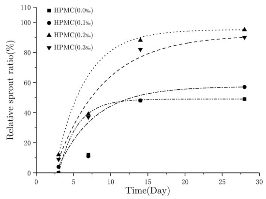Figure 8 clearly shows that the vegetarianism in PVC-0 developed slowly both in the sprout ratio and sprout time. It is noticed that with the packing material dissolving, mass of organic constituent, soluble salt and spores of probiotics for plant immersed in soil, the dissolving process benefited plant growth in the control group. However, this kind of situation may not contribute to group PVC-0 and PVC-1. Mostly because the narrow channel and unconnected void in PVC-0 and PVC-1 cannot support sufficient space for water retained, the result is that the packing materials around the seeds is not soluble at room temperature and forms a gel-like solution. From these appearances, it can be deduced that the packing material around the seed cannot be dissolved in a filling solid because of the narrow space in PC-0. This phenomenon was also be recommended in the previous research [,,].