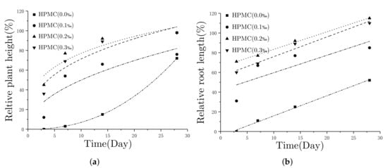 Curves of vegetarian development in PVC-0, PVC-1, PVC-2, and PVC-3. (a) Relative height of the plant versus time; (b) relative root length of the plant versus time.