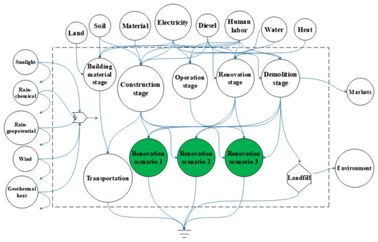 To date, there are many methods for building system design and evaluation. Therein, the emergy approach [16] has an obvious advantage to assess sustainability, which can realize a unified platform to compare the different systems to confirm the sustainability level. It can be used for a lot of systems, such as agricultural studies [17,18], city system [19,20], green building direction [21,22], production system [23,24], ecology [25], pollutant treatment system [26] and traffic field [27], etc.