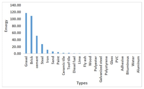 The details of energy in the building system can be described as follows: For instance, the emergy theory and building information modeling were combined into a building system to evaluate sustainability [28]. For building refurbishment, several strategies have been conducted based on the emergy-LCA method [29]. As the basic components of a building system, building materials sustainability has been also a concern by scholars [30,31,32]. By using emergy evaluation, the major highway building was assessed for decision making in Italy [33]. Take a zero-energy building, for example, American scholars have redefined zero-energy buildings based on the emergy approach [34]. Lin and William studied the high-density and high-rise buildings by using emergy analysis to calculate density parameters [35]. To measure the renovation effect, emergy method has been selected to assess environmental performance [36]. Hwang and William considered the emergy analysis for building uncertainty [37]. By integrating the emergy method, energy analysis, and Taguchi-regression method, the building system has been evaluated [38].