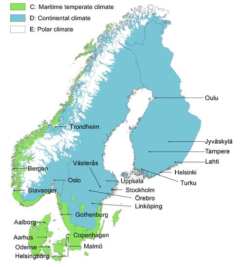 Climate Classification map for Nordic countries according to the Köppen–Geiger system—all cities above 100,000 inhabitants are marked (2016). Reprinted with permission from Ref. [].