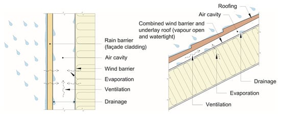 Illustration of the principle of two-stage weatherproofing for a façade (left) and a roof (right). Reprinted with permission from Refs. [,].
