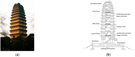 China is an ancient civilization with a long history. As a part of Chinese history and culture, ancient pagodas play an extremely important role in the history of Chinese architecture [1]. As an outstanding representative of an ancient pagoda that shows the early use of dense eaves in China, the Small Wild Goose Pagoda has attracted much attention at home and abroad because of its unique historical value and cultural connotation. However, as the Pagoda has stood for thousands of years, it has experienced the vicissitudes of history and man-made destruction, the tower body has been damaged to varying degrees, its seismic performance has been severely reduced, and it will be difficult for the Pagoda to withstand more earthquakes in the future. Therefore, the protection and ability of the Small Wild Goose Pagoda to resist disasters is an important issue [2]. Figure 1 shows the extant Small Wild Goose Pagoda.