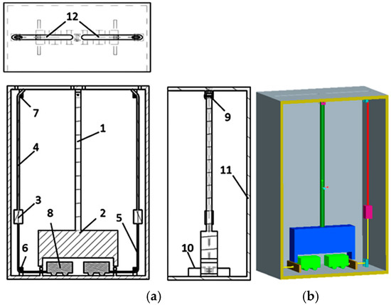SMA-SPDS structure diagram. (a) Construction details. (b) Three-dimensional structure. 1—Pendulum rod; 2—Mass vibrator; 3—Wire conversion joint; 4—Steel cable; 5—SMA; 6—Bottom steering pulley; 7—Upper steering pulley; 8—The small car; 9—One-way hinge; 10—Baffle; 11—The shell; 12—Steel cable channel.