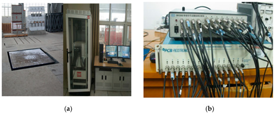 The experiment was conducted in the Seismic Laboratory of Structural Engineering of Xi’an University of Architecture and Technology. The test adopted a 3-way 6-degree-of-freedom electrohydraulic servo simulation control vibrator produced by MTS, USA. The parameters were as follows: the size of the vibration table was 4.1 m × 4.1 m; the weight of the fully-loaded specimen was 30T; the maximum horizontal acceleration at full load was 1.5 g; the maximum vertical acceleration was 1.0 g; the maximum overturning bending moment was 80 T.m; the maximum eccentric bending moment was 30 T.m (Figure 5a). A PCB acceleration sensor and a type 891 displacement sensor were used for the acceleration and displacement data, and an LMS data acquisition instrument was used for the test data collection (Figure 5b).