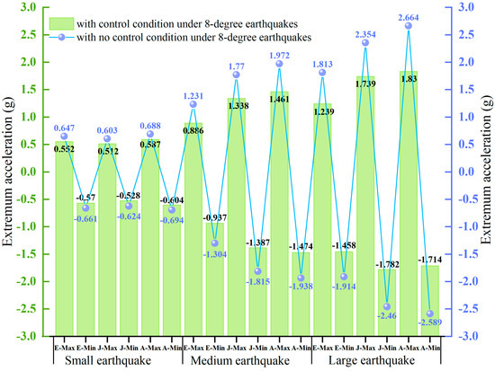 The extremum acceleration of the top floor of the tower with control condition under 8-degree earthquakes (g).