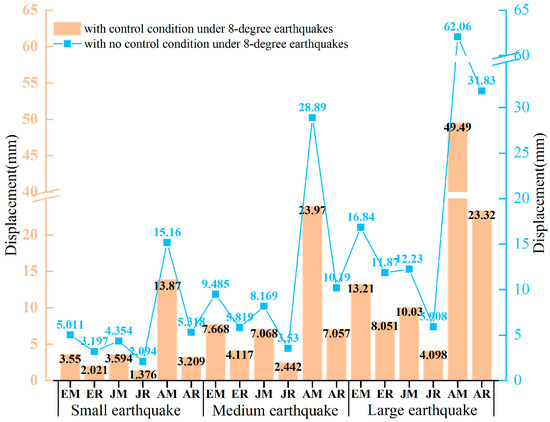 To compare the optimal control effects of the SMA-SPDSs, the top floor of the structure was taken as the research object, and the optimal control effects under different vibration modes were analyzed. Figure 17, Figure 18, Figure 19, Figure 20, Figure 21 and Figure 22 show the time records of the displacement and acceleration on the top floor of the Small Wild Goose Pagoda with different order modes controlled by different seismic records under the action of an 8-degree earthquake.