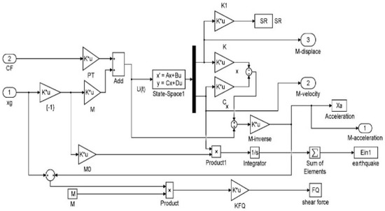 From this state equation, the displacement and velocity of the main structure of the Small Wild Goose Pagoda relative to the ground can be solved, while the acceleration is not suitable for the derivative derivation module in Simulink. The output of the derivative module can be solved by an approximate value. To reduce the error of the result, the structural acceleration can be directly obtained by the following formula: