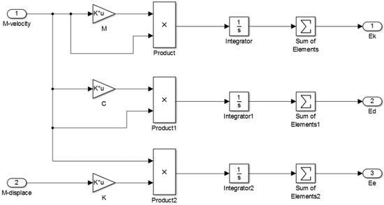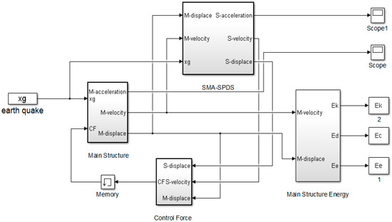 The main simulation model of the Small Wild Goose Pagoda shock absorption structure in Simulink is shown in Figure 12. The model consists of four major subsystems: the main structure, SMA-SPDS, control force, and main structure energy. The two inputs and are the seismic acceleration and passive control force, respectively. The three outputs M-acceleration, M-velocity, and M-displacement are the acceleration, velocity, and displacement of the main structure of the Small Wild Goose Pagoda relative to the ground, respectively. Ek, Ee, and Ec are the kinetic energy, deformation energy, and damping energy consumption of the main structure of the Small Wild Goose Pagoda, respectively.