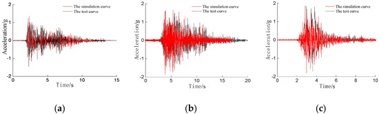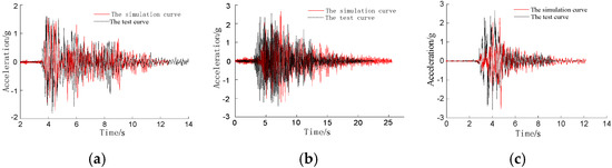 Comparison diagram of the acceleration simulation and test on top of a controlled tower under an 8-degree large earthquake. (a) El-Centro record. (b) Jiangyou record. (c) Artificial wave.
