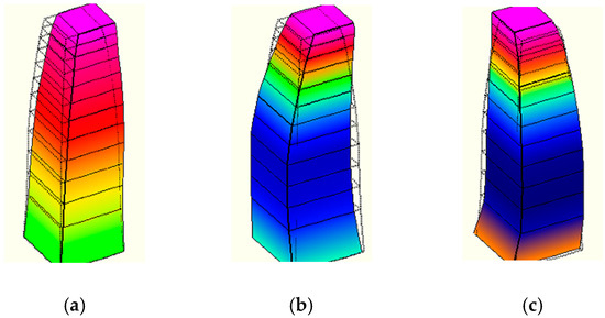 Mode modal diagram of the Small Wild Goose Pagoda. (a) First-level mode. (b) Second-level mode. (c) Third-level mode. (Note: the color change of each mode only indicates the amplitude change of that mode).