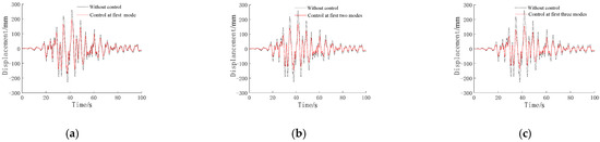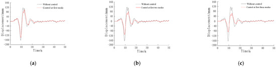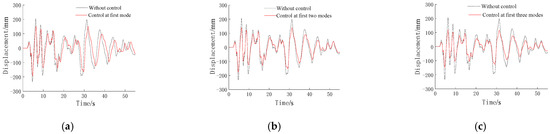 Time history of displacement by optimized control at different modes under the Jiangyou seismic record. (a) First mode. (b) First two modes. (c) First three modes.