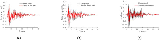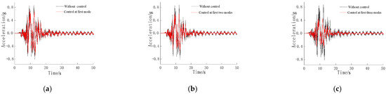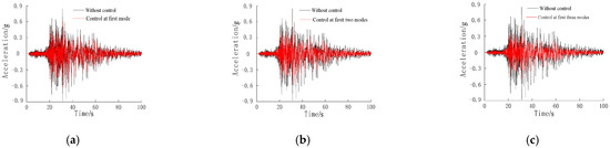 Time history of acceleration by optimized control at different modes under the Jiangyou seismic record. (a) First mode. (b) First two modes. (c) First three modes.