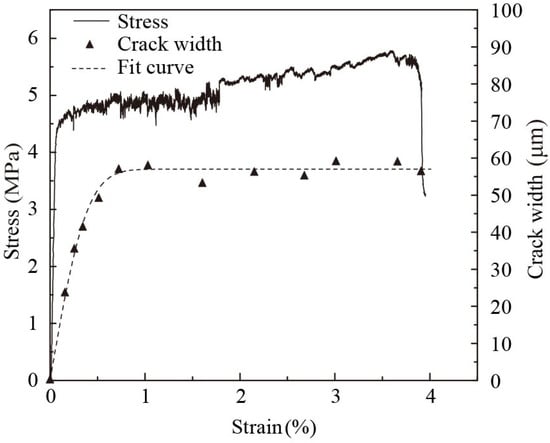 Engineering cement-based composite (ECC) has been extensively studied as a new type of ductile cementitious material with strain hardening characteristics since its appearance in 1990s [,,,]. The difference between ECC and normal concrete is that it can form several small cracks to obtain super-high tensile ductility (>3%) []. Figure 1 shows a typical uniaxial tensile stress-strain curve [,,]. After the first crack, the tensile load capacity continues to increase, resulting in a macroscopic strain-hardening phenomenon accompanied by multiple micro-cracking, and failure after reaching the ultimate strength. Based on the micro fiber bridging and micro mechanical design framework, the average crack width in ECC can be controlled within 60–80 m [], which makes it particularly suitable for the development of bacterial based ductile concrete without relying on special carriers. As mentioned above, compared with the immobilized bacteria technology, the bacterial concrete with air entraining agent can heal cracks with a width of 0.3 mm, but it is still far beyond the typical crack width range of ECC material.