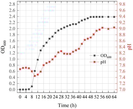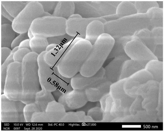 The medium for S. pasteurii cultivation is consisted of 0.13 mol/L Tris (pH = 9), 20 g/L yeast extract, 10 g/L ammonium sulfate and 5 g/L sodium chloride. After preparing the medium solution, it was put into 121 °C autoclave for sterilization. Then, the activated S. pasteurii was inoculated into the sterilized medium in the super clean platform, and cultured for 24 h under condition of 30 °C and vibration of 220 rpm. In order to evaluate the bacteria growth, the concentration of bacteria was measured by spectrophotometer (AQ8100, Shanghai) every two hours. The optical density curve of bacterial growth is shown in Figure 2. S. pasteurii grew rapidly in the first 24 h, and then entered a stable phase after 48 h, whereby the cell density was about 1.95 × 10 cells/ml with 2.4 OD value. In biological studies, OD indicates the absorbance value at 600 nm, i.e., the higher absorbance value represents higher bacteria concentration. At the same time, the pH of the bacterial solution increased with the growth of the bacteria and eventually stabilized at about 9. This is because bacteria decompose urea to produce a large amount of hydroxide, which leads to an increase in the alkalinity of the solution. This environment has a facilitating effect on the precipitation of calcium carbonate. Figure 3 shows the morphology of bacteria observed under scanning electron microscope (SEM) after centrifugation and freeze-drying of bacterial solution cultured for 48 h, which is long strip, 1.32 m in length and 0.58 m in width.
