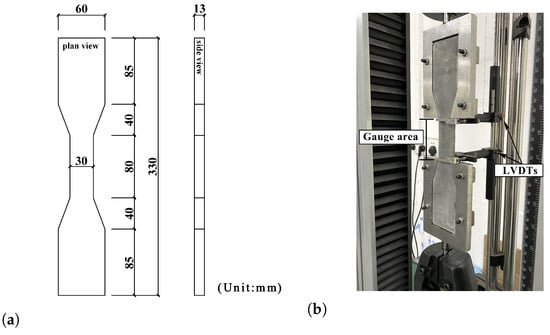 The uniaxial compression test specimens were 40 × 40 × 40 mm in size. Under condition of a loading rate of 2 mm/min, the compressive strength of 7 days and 28 days are measured, respectively. The compressive strength of each ECC mixture is determined by three valid test data. Meanwhile, uniaxial tensile tests were carried out on specimens cured for 28 days to evaluate the tensile properties of ECC material. The tensile test setup and geometric dimensions of the specimens are shown in Figure 4. Sample sizes in the gauge area are 80 mm (length) × 30 mm (width) × 13 mm (thickness). Due to the relatively small cross section area of the gauge, most cracks are likely to occur in the gauge region during tension, which ensures the reliability of the tensile strain measurement []. Two external Linear Variable Differential Transformers (LVDTs) are installed at the end of the gauge area of the specimen to record the displacement for strain calculation. The tensile test was performed under the displacement control of 0.3 mm/min to simulate the quasi-static loading conditions. At the end of the test, the number of cracks and the crack width of the ECC specimens after tension were recorded [,].