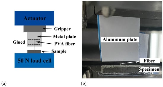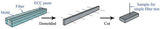 The mechanical properties of the fiber/matrix interface were characterized by single fiber pullout tests, and the interface parameters such as chemical bond (), frictional bond strength () and slip-hardening coefficient () were obtained, of which detailed parameter formulas can be found in Refs. [,]. The sample preparation is shown in Figure 5, the PVA fiber is fixed equidistantly in the middle of the mold with double-sided tape, and then the fresh mortar matrix (without fiber) is poured into the mold. After 24 h, the sample was demolded for sequent standard curing. Before the fiber pullout tests, the mortar matrix were cut with 1.5 mm thickness for each specimen, ensuring that the debonding process could be captured successfully when fibers were pulled out. Figure 6 shows the detailed fiber pullout tests setup. The sample was fixed on a 50 N precision load cell, the free end of the fiber was fixed on the aluminum plate with strong glue, which was fixed on the top gripper. The test was displacement controlled with loading speed of 0.3 mm/min [].