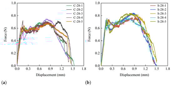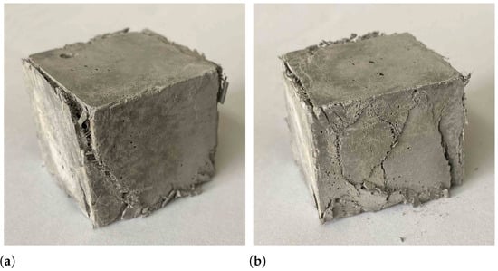 Two groups of ECC mixtures were subjected to compression tests, and the compressive strength at 7 and 28 days of curing was measured. In order to evaluate the strength regain by bacteria, all samples were compressed after the peak load with same residual strength and then healed for 28 days, the curing method has been described in detail in the previous study [,]. Then the compression tests were conducted to observe the change of compressive strength before and after self-healing. The relevant data have been listed in Table 3 and Table 4 (C7-1 represents the first specimen in the control group that has been cured for 7 days). The failure pattern of ECC and S.p.-ECC compressed specimens after complete damage is shown in Figure 7.