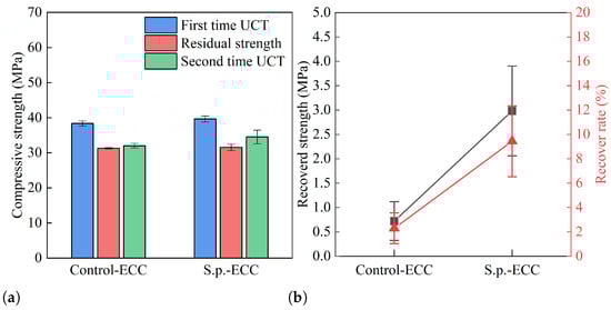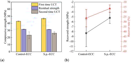 Strength recovery of ECC samples at Standard cured (28 days). (a) Compressive strength for repeated compression tests. (b) Strength recover rate.