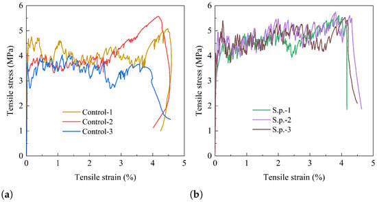 Tensile stress-strain experimental curve of ECC. (a) Without bacteria. (b) With bacteria.