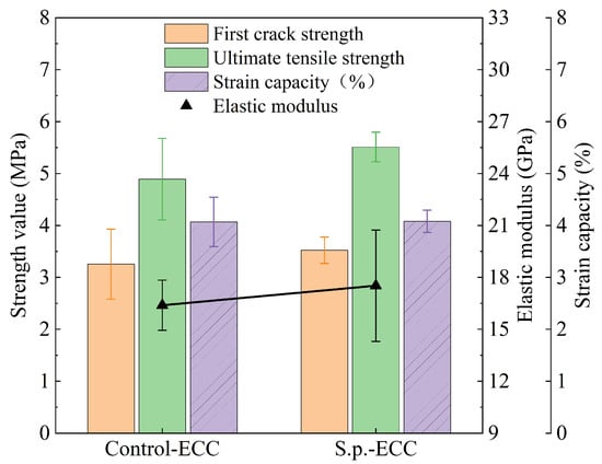 It can be seen from Figure 11a,b that compared with the control group, the incorporation of S. pasteurii has little effect on the tensile strain capacity of ECC material, and both show apparent tensile strain hardening behavior, with the average strain capacity of 4.07% and 4.08%, respectively. As shown in Figure 12, the tensile strength of ECC mixed with bacteria was 5.51 MPa, which was 12.7% higher than that of the control group (4.89 MPa). At the same time, the matrix properties of the ECC mixture also changed, and the elastic modulus increased from 16.39 GPa to 17.52 GPa. The tensile test results show that the incorporation of bacteria has a positive regulatory effect on the mechanical properties of ECC mixture.