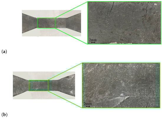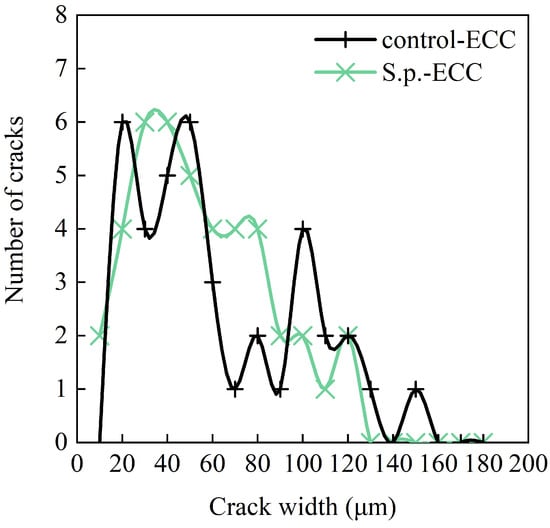 Unlike conventional brittle concrete, ECC has unique ability to control the width of cracks [,]. Therefore, the crack width is also considered a significant material property, which affects the structure’s durability. The typical cracking pattern of the specimen after the tensile test is shown in Figure 13, it can be roughly seen that the cracks of the S.p.-ECC are finer and denser. The optical microscope was used to observe and record the cracks, with an accuracy of 10 m, and the statistical results are shown in Figure 14. Compared with the control-ECC, the maximum crack width of S.p.-ECC decreased while the narrow cracks increased. This observation seems to suggest that the S.p.-ECC specimen may have lower water permeability and aggressive ion permeability coefficient, leading to better durability.