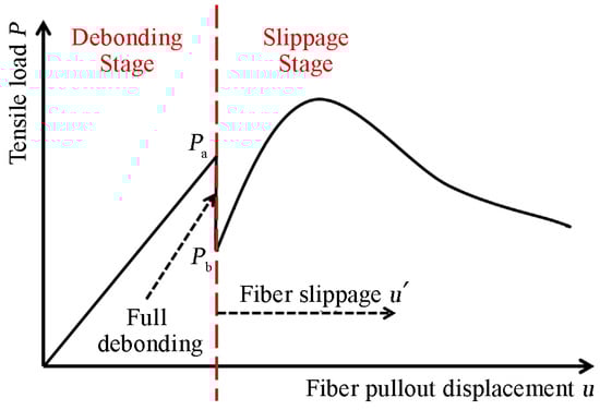 Fiber pullout includes two stages, i.e., debonding stage and slippage stage, as shown in Figure 15. In the debonding stage, the pullout force was mainly caused by the bonding of the fiber segment in the debonding zone to the interface. The longer the debonding distance, the greater the pulling force. The sudden load drop corresponds to the full debonding of fiber from the matrix, which divides the fiber pullout process into the preceding debonding stage and the following slippage stage. Two constitutive parameters, namely chemical bond () and friction bond (), can be deduced from the single fiber pullout curve to describe the interfacial bond properties using following equations.