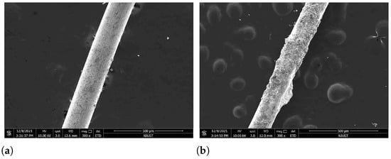 The single fiber pullout curves of the two ECC mixtures are shown in Figure 16, and at least five valid data are obtained for each group. At the same time, the fiber/matrix interface parameters, including , and , were calculated for each group of curves, as shown in Figure 17 and Table 7. Compared with control-ECC, the chemical bond of S.p.-ECC decreased from 0.885 J/m to 0.231 J/m. The lower chemical bond means that the fibers are more likely to detach from the surrounding matrix and enter the slip stage, which is essential for continued cracking of the matrix. The decrease of chemical bond may be due to certain bacterial mineralization products attached to the surface of the PVA fiber. To test this hypothesis, a portion of the PVA fiber was taken from the fracture of the ECC specimen after stretching and observed with SEM. As shown in Figure 18, many bacterial mineralization products were attached to the surface of the fibers in S.p.-ECC group, whereas this was not the case for the fibers of the control-ECC. In addition to the original coating of the fibers, the encapsulation of precipitated material on the PVA fibers further reduces the Al and Ca concentrations at the fiber/matrix interface. Since these two ions are essential for the formation of a strong interfacial thin layer between the PVA polymer and the surrounding hydration products, their lower concentrations will reduce the chemical bond.