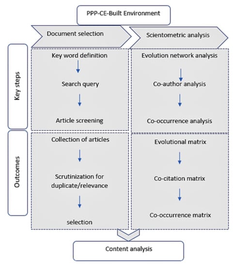 This paper is structured in sections. Section 1 presents the need for the study, an overview of the CE and the built environment, and the contribution of the current study given the existing body of knowledge. Section 2 presents the research methodology, including the scientometric and content analysis undertaken, involving the search strategy, paper screening, and analysis tools and methods. Section 3 provides the results of the comprehensive analysis of the countries, institutions, authors, journals, and papers in this field and the content analysis. Recommendations and conclusions are presented in Section 4 and Section 5, respectively.