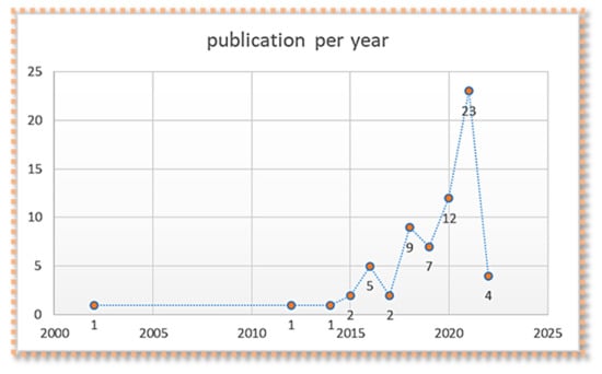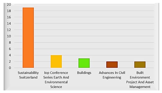 Figure 3 depicts the distribution of 67 bibliographic records from 2002 through 2022. Since 2002, there has been a gradual increase in the number of publications. Since 2012, participation in the CE in the building and construction industry has received more attention, particularly following the Rio + 20 conference in 2012, which highlighted the private sector’s growing role as a developmental stakeholder. From the retrieved data, 201 authors contributed to 67 papers and published in 84 journals, and according to the information gathered, 201 writers contributed to 67 papers that were published in 84 journals. The majority of the publications, however, were published in Sustainability, Buildings, and Advances in Civil Engineering (Figure 4).