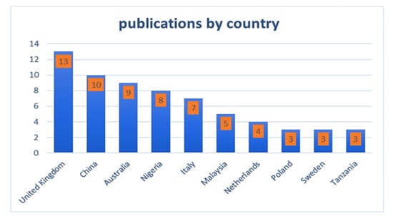 Figure 6 depicts a network representing the regional distribution of articles about private sector partnerships in the built environment relevant to the CE. This network has 16 nodes and 26 linkages, as shown in Figure 5. As determined by retrieved articles on PPP and the CE, the main countries in the construction industry can be identified by network analysis. In Figure 6, the number of articles in the UK (13), China (10), Australia (9), Nigeria (8), and Italy (7) suggests that these countries have made major contributions to research in the building and construction industry on private sector partnerships for the CE. The UK made the most important contribution to the development of CE research in the building industry in terms of publications by country. Furthermore, in terms of international collaborations, Australian academics have extensive collaborations with researchers from other nations, including Malaysia, Tanzania, the UK, and Nigeria.