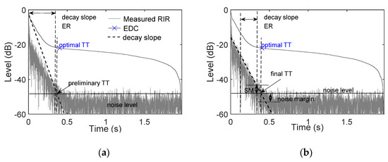 Precise determination of TT is difficult in practice. According to the research [16], the TT can be manually determined by a simple method of an intersection of the main decay slope and the noise floor level. However, the non-exponential decay and the characteristic curvature in the EDC make the decay slope dependent on the ER [8,15], as seen in the decay slope (black dotted curve) in Figure 1. Observing Figure 1a, when the measured RIR has high initial peaks, the corresponding EDC presents a non-exponential decay behavior. The decay slope estimated in the ER, ranging from the beginning of the RIR to a certain point some dBs above the assumed noise level, is decreased, resulting in a smaller value of the preliminary TT than the optimal TT. In order to reduce the influence of the non-exponential decay of the EDC on the decay slope estimation, the ER can be manually adjusted using an additional slope margin (SM) and a noise margin [15]. In the case presented in Figure 1b, the influence of the initial peak of the RIR on the decay slope is decreased, causing the generated final TT close to the optimal TT.