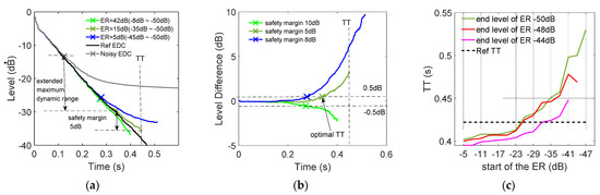 Regarding the truncation process, the optimal TT represents the minimum deviation of the resulting truncated EDC with the reference decay curve, which gives the correct decay slope and RT. Figure 3 presents the truncated EDCs resulting from noise subtraction, RIR truncation at the detected TT, correction term calculated by the TT, and decay slopes of different ER. In the case of an end level of −50 dB given in Figure 3a, the change of the start level of the ER affects the decay slope of the decay curves, causing them to deviate from the reference EDC, thus leading to different TT values. Observing Figure 3c, the closer the start of the ER to the beginning of the RIR, the smaller the detected TT value, leading to a characteristic drop of the EDC tail (green curve). On the other hand, the different pre-setting interval lengths lead to the variable end levels of the ER values (see the green decay curve in Figure 3c). With a fixed start level of the ER, the deviation between the TT and the reference TT increases, with the end level of the ER increasing. In this case, the maximum deviation of the TT is detected when the end of the ER approaches to the estimated mean noise level of −52 dB. The deviation is up to about 10 dB when the last 7 dB is used, as seen in the blue decay curve given in Figure 3b, which is the reason for leaving a safety margin of 5–10 dB above the level corresponding to the TT [9,10].