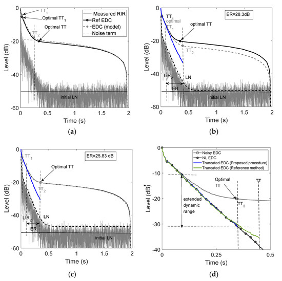 The comparison of the truncated EDCs of the reference method and the proposed procedure is presented in Figure 4d. The truncated EDC generated from the ER shown in Figure 4c,d is identical to the NL EDC above the optimal . Section 4.1 has illustrated the complexity of detecting the optimal TT of the reference method. The decay level at the TT is shifted upward to obtain the optimal TT using the safety margin of approximately 5 dB. Nevertheless, the deviation in TT can be automatically excluded from the proposed procedure without applying the safety margin. The deviation at the between the truncated EDC and the NL EDC is only 0.22 dB, leading to a slight increase in the dynamic range. The decay level of the extended to −31 dB. In all the observed cases, the proposed procedure provides a fully automated way to filter out the influence of the random fluctuations and high initial peaks of the RIR on the TT determination.
