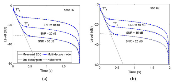 Figure 5 presents the EDCs resulting from the double-slopes decays model with the parameters generated after the proposed procedure, which agree well with the reference EDCs of the measured RIRs at 1000 Hz and 500 Hz with three different resulting SNRs. The decay characteristics represented by these three curves are the same. The decay model curves consist of two exponential decay terms and one noise term. In those EDCs, a rapid decline occurs on the decay curve above . The model describes that part reasonably well, leading to minor shifts at . The ∆E1 presented in Table 1 is below 0.1 dB representing that the is essential for defining the start point of the decay rate . On the other hand, the ∆E2 is below 0.1 dB at , causing the relative error of the estimated DT is less than 0.6% at the 1000 Hz octave band and less than 1.1% at the 500 Hz octave band. The noise term 10log10(shows a tiny shift from the measured EDC near the end of the time, which has less influence on the .