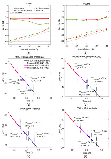 Comparison of the results of the proposed procedure and the reference method with added pink noise (−60 dB to −40 dB) and band-pass filtering at the 1 kHz and 500 Hz: (a,b) The proposed procedure gives more stable parameters of LIR2 and LN. (c,d) Comparison of the truncated EDCs of the proposed procedure using the parameters in (a,b) from the reference NL EDC with the and (e,f) Comparison of the truncated EDCs of the reference procedure using the parameters in (a,b) from the reference NL EDC with the and .