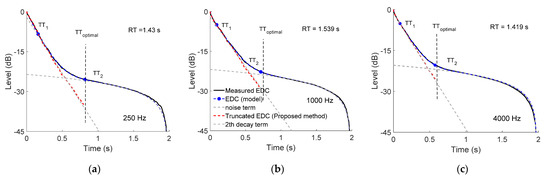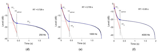 Even though this procedure can be applied to a virtually unlimited number of slopes, this paper only analyzes the measured RIRs with double-slope decays. The symbol is the TT corresponding to the main decay slope and represents the bending point of the two decay terms [19]. The amplitude parameters , and decay slopes ( are mutually dependent. The displacement of TT from the optimum is demonstrated through the determination of RT, using the noise compensation mentioned in Figure 1. Considering the difficulties of manual adjustment operation in TT, the model Equation (3) incorporated in the noise compensation method [10] is conducted to automated determine the ER by the model parameters and The parameters are iteratively achieved by minimizing the deviation between the decay levels of the EDC at the TT of the measured RIRs and the backward integrated non-exponential decay model Equation (3) in terms of the Schroeder decay model [18,27],