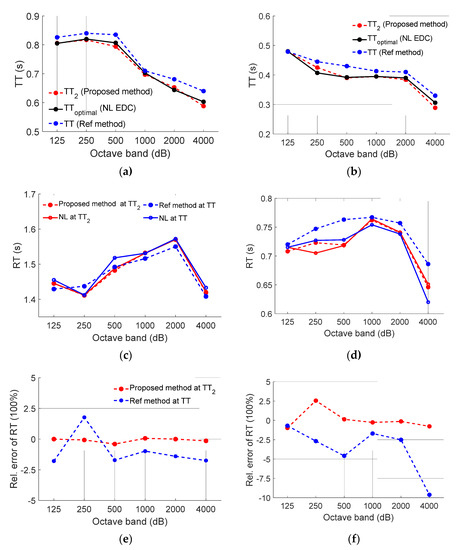 The proposed method significantly reduces the truncation error, which leads to more stable results, yielding somewhat minor differences between the detected and the . The values of the are typically close to the , as shown in Figure 8a,b. The proposed method leads to similar maximum relative errors of the RTs estimated at the compared to the reference results, which were 2.55% for room A and 0.4% for room B. Compared to the , the maximum time difference of the is 75 ms while the value for is 17 ms. Furthermore, the deviation between the truncated EDC generated from the proposed method and the NL EDC at is relatively small, and it is less than 0.5 dB. However, the deviation of the between the truncated EDC of the reference method and the NL EDC is up to 1.8 dB. For the octave bands given in Figure 8e,f, the mean absolute values of the relative errors of RTs estimated at are 3.63% for room A and 1.56% for room B. The mean absolute values of the relative errors of RTs estimated at the are similar to that of the reference results. The mean absolute values are approximately 0.81% and 0.11%, respectively. Compared to the reference method, the proposed method provides a slightly better iterative procedure than the reference method since the proposed procedure enables the close to the optimal TT.